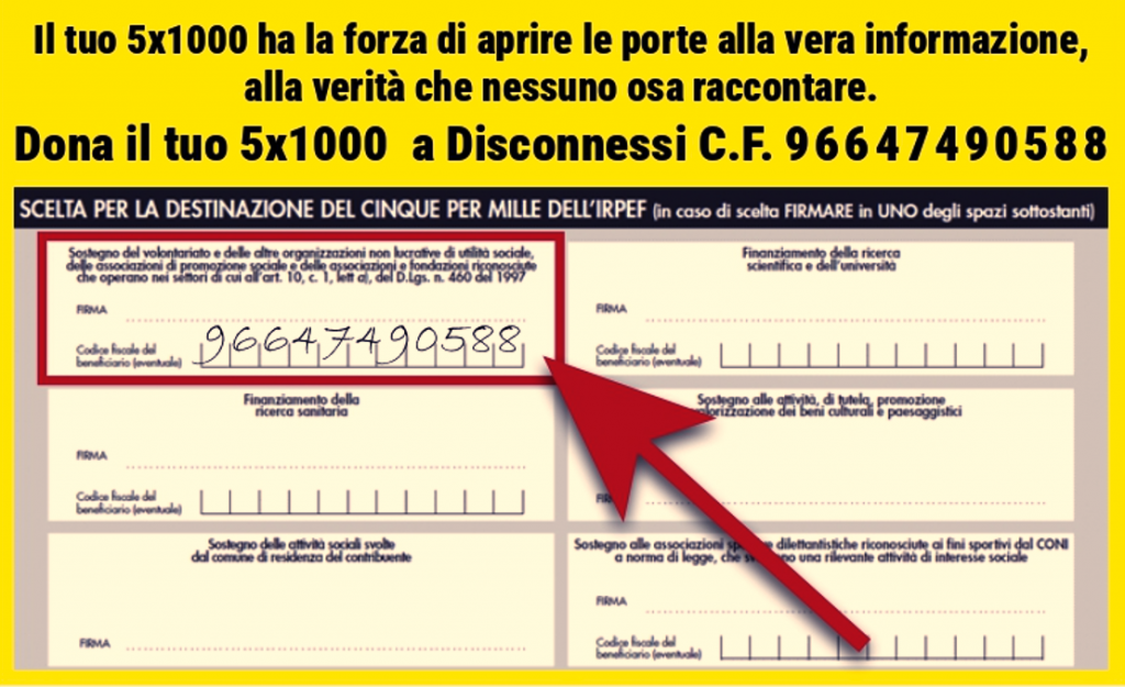 Come fare? Basta inserire il nostro codice fiscale 96647490588 ed apporre la tua firma nel primo riquadro, destinandoci gratuitamente il tuo 5×1000. Per te non ha alcun costo ma per l’azione di informazione libera e indipendente di Disconnessi è invece una forma di sostegno di vitale importanza.