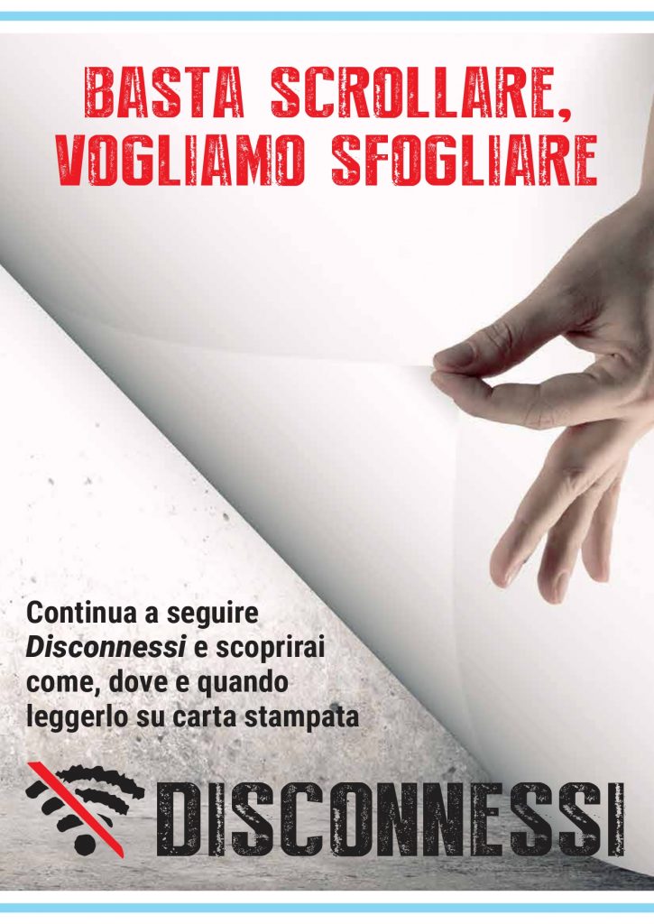 “Basta scollare, vogliamo sfogliare”: come promesso parte la campagna abbonamenti di Disconnessi. Subito offerte imperdibili e accessibili a chiunque. Sarà possibile sottoscrivere l’abbonamento in diverse formule per leggere il giornale on-line ma anche per ricevere la nuova rivista mensile cartacea. Tornando a sfogliare. “Un grande sforzo editoriale e non solo giornalistico reso possibile grazie al lavoro straordinario di una meravigliosa squadra di professionisti collaboratori, vogliamo soddisfare richieste e aspettative dei nostri lettori in un salto di qualità dell’informazione libera e indipendente italiana “, afferma il direttore Maurizio Martucci.