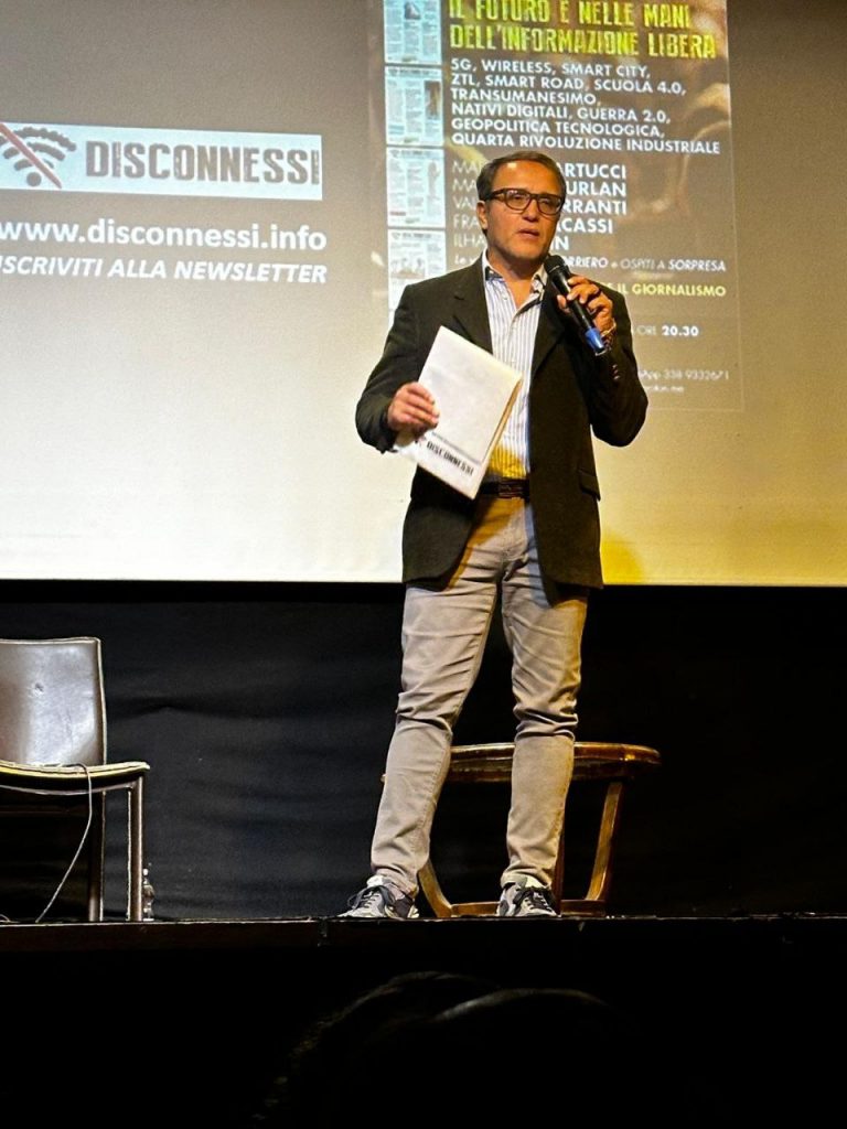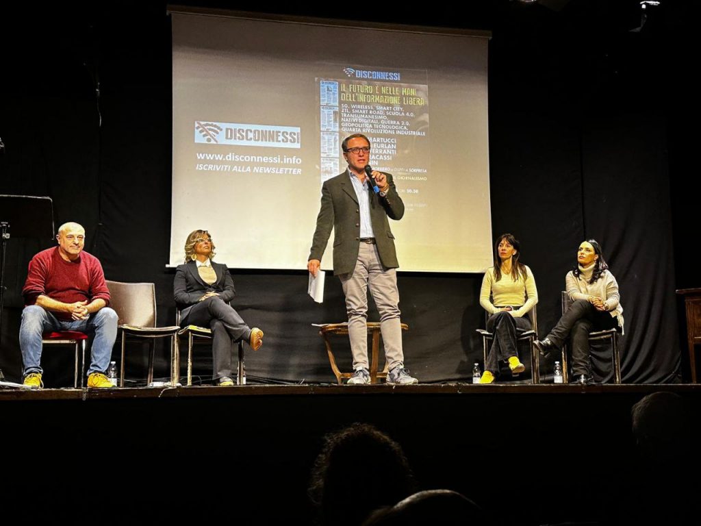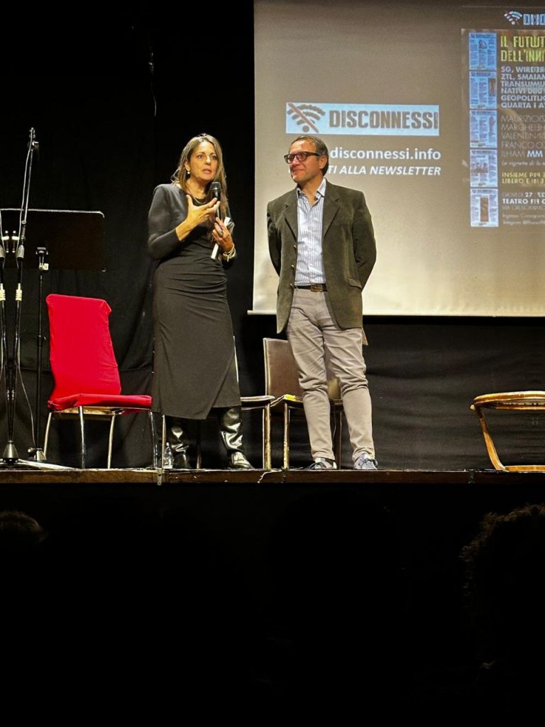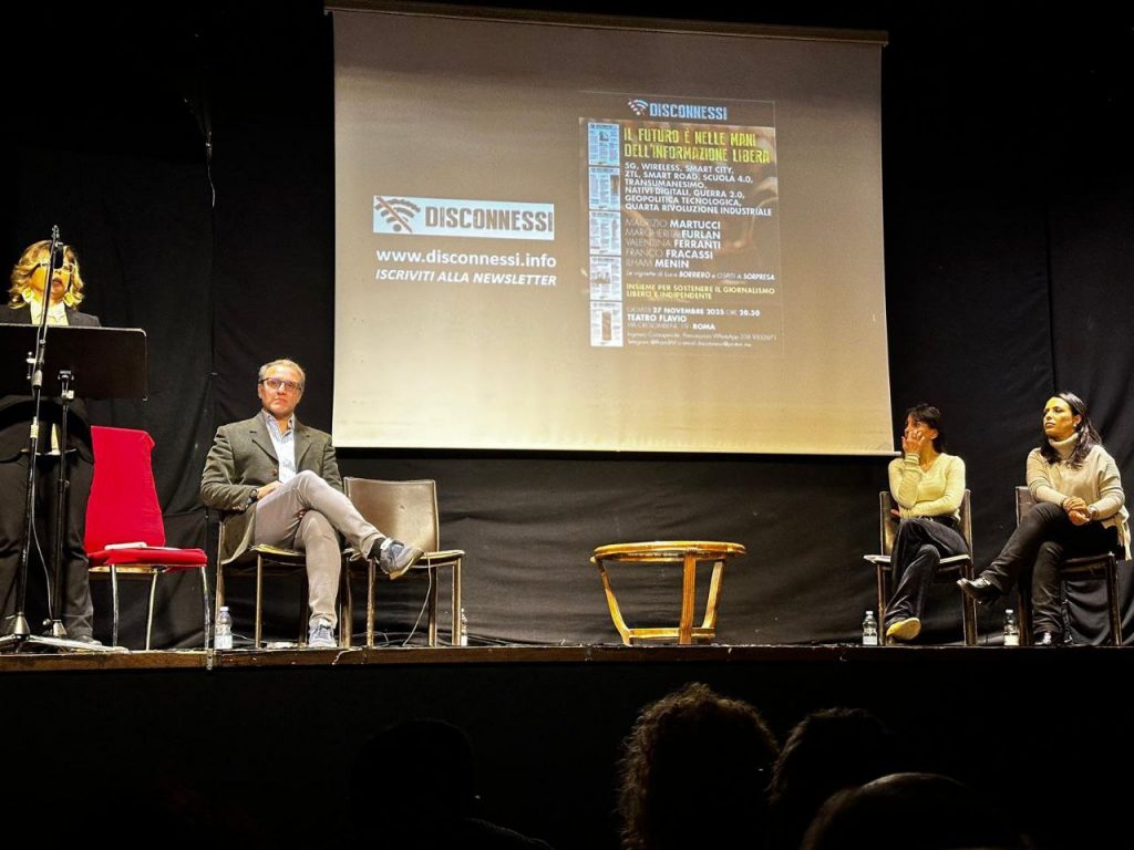 Roma, ieri in scena la prima uscita pubblica di Disconnessi. Sul palco del centralissimo Teatro Flavio si sono alternati direttore e collaboratori del giornale: Maurizio Martucci, Margherita Furlan, Franco Fracassi, Valentina Ferranti e Ilham Menin. Ospite a sorpresa Tiziana Alterio, pubblico intrattenuto anche dalle vignette disegnate da Luca Borriero. L’annuncio: a breve la campagna abbonamenti, nel 2026 Disconnessi uscirà anche in edizione cartacea. “Basta scrollare, torniamo a sfogliare”. Presto tutte le coordinate su come abbonarsi.