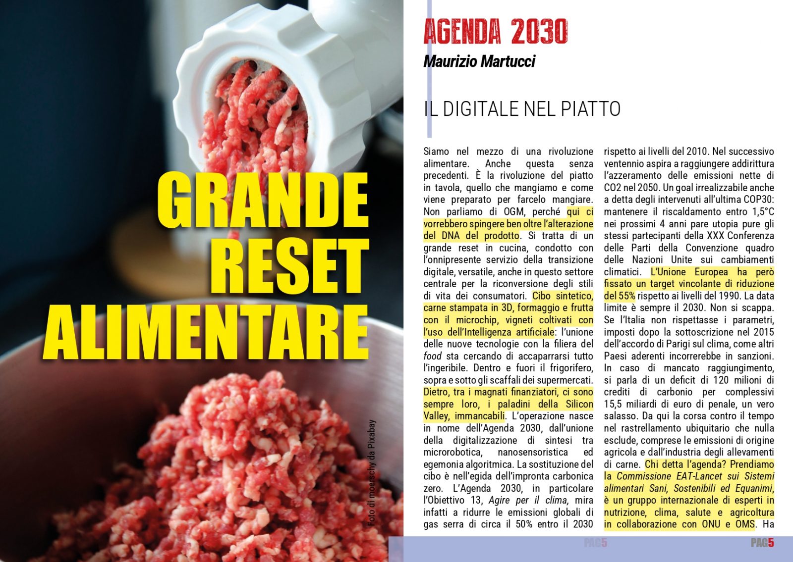 Siamo nel mezzo di una rivoluzione alimentare. Anche questa senza precedenti. E’ la rivoluzione del piatto in tavola, quello che mangiamo e come viene preparato per farcelo mangiare. Non parliamo di OGM, perché qui ci vorrebbero spingere ben oltre l’alterazione del DNA del prodotto. Si tratta di un grande reset in cucina, condotto con l’onnipresente servizio della transizione digitale, versatile, anche in questo settore centrale per la riconversione degli stili di vita dei consumatori. Cibo sintetico, carne stampata in 3D, formaggio e frutta con il microchip, vigneti coltivati con l’uso dell’Intelligenza artificiale: l’unione delle nuove tecnologie con la filiera del food sta cercando di accaparrarsi tutto l’ingeribile. Dentro e fuori il frigorifero, sopra e sotto gli scaffali dei supermercati. Dietro, tra i magnati finanziatori, ci sono sempre loro, i paladini della Silicon Valley, immancabili. L’operazione nasce in nome dell’Agenda 2030, dall’unione della digitalizzazione di sintesi tra microrobotica, nanosensoristica ed egemonia algoritmica. La sostituzione del cibo è nell’egida dell’impronta carbonica zero.