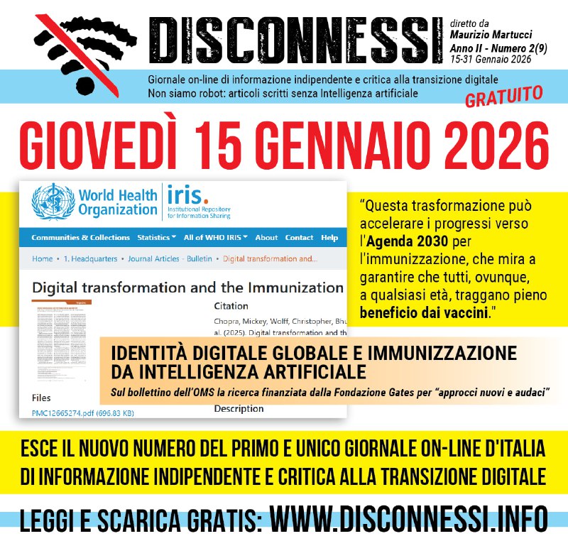Giovedì 15 Gennaio 2026 esce il nuovo numero di Disconnessi, il primo e unico giornale d’Italia di informazione libera, indipendente e critica alla transizione digitale fondato e diretto dal giornalista Maurizio Martucci. Ancora una volta pagine tutte da leggere con inchieste e notizie sui lati oscuri della digitalizzazione nell’avanzamento tecnologico.