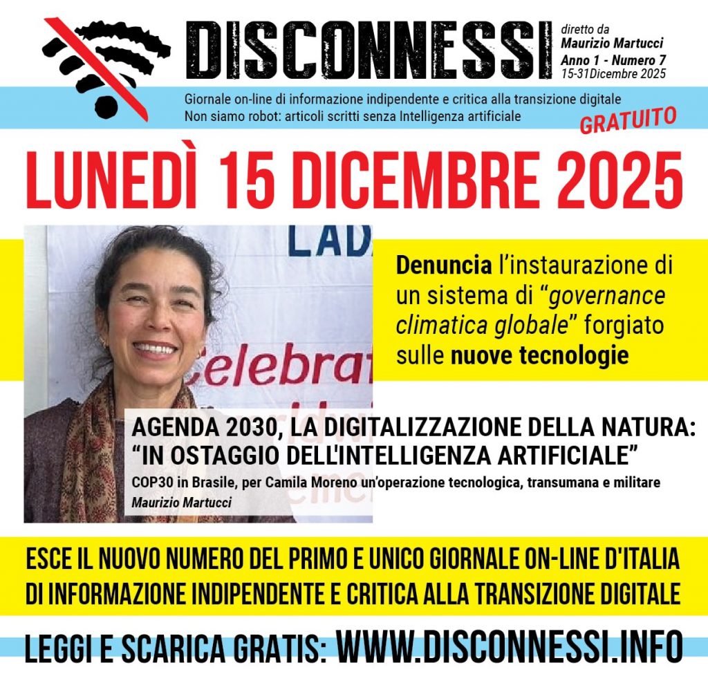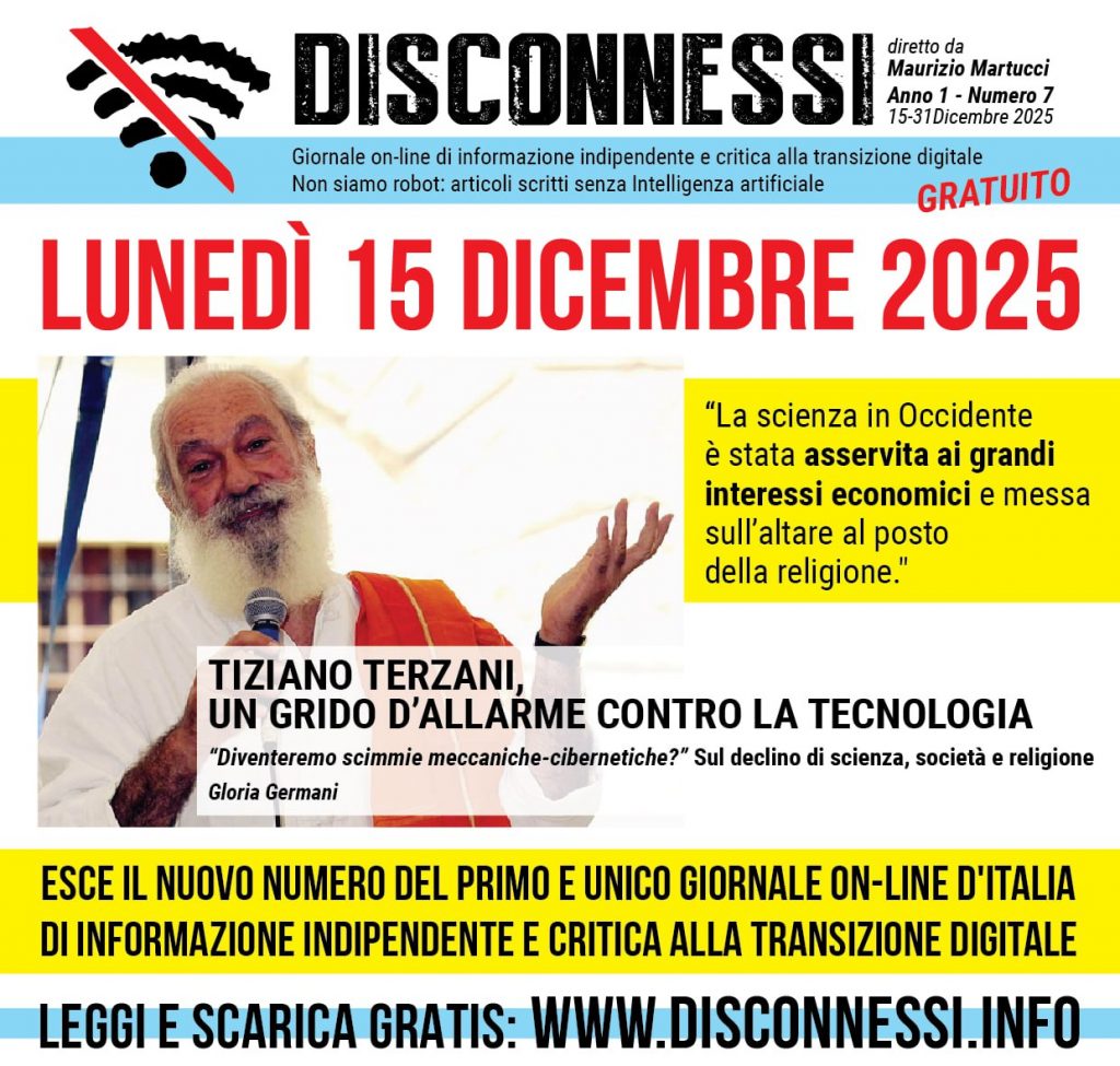 Come ogni 1° e 15 del mese, lunedì 15 Dicembre uscirà il nuovo numero di Disconnessi, come sempre tutto da leggere e ancora una volta gratuito: interviste, esclusive, commenti, inchieste, approfondimenti, ultim’ora e documenti in anteprima per i lettori del primo e unico giornale d’Italia d’informazione libera e critica alla transizione digitale.